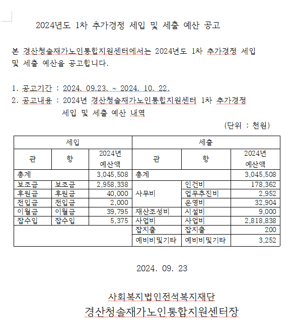 2024년 제1차 추가경정 예산공고 페이지 정보 작성자 최고관리자 댓글 0건 조회 361회 작성일 24-09-23 15:12 본문 2024년 제1차 추가경정 예산을 공고합니다. 목록 이전글2024년 노인일자리 담당인력 공개 모집 24.09.23 다음글2024년 노인맞춤돌봄서비스 종사자(사회복지사)를 채용공고 24.08.30 댓글목록 댓글목록 등록된 댓글이 없습니다.