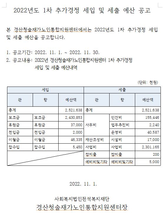 2022년도 1차 추가경정 세입 및 세출 예산 공고 페이지 정보 작성자 최고관리자 댓글 0건 조회 1,604회 작성일 22-11-01 14:16 본문 2022년도 1차 추가경정 세입 및 세출 예산 공고합니다. 목록 이전글2022년도 재가노인통합지원센터 종사자(조리원) 공개모집 22.11.09 다음글2022년도 재가노인통합지원센터 종사자(조리원) 공개모집 22.10.25 댓글목록 댓글목록 등록된 댓글이 없습니다.